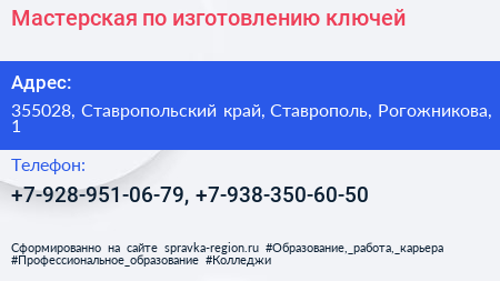 Мастерская по изготовлению ключей по адресу 355028, Ставропольский край, Ставрополь, Рогожникова, 1 в дальнейшем Организация, размещена в следующих категориях: