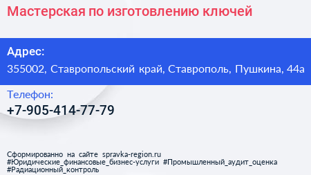 Мастерская по изготовлению ключей по адресу 355002, Ставропольский край, Ставрополь, Пушкина, 44а в дальнейшем Организация, размещена в следующих категориях: