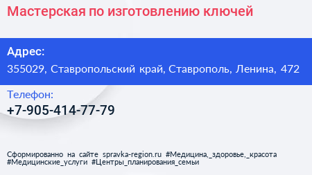 Мастерская по изготовлению ключей по адресу 355029, Ставропольский край, Ставрополь, Ленина, 472 в дальнейшем Организация, размещена в следующих категориях: