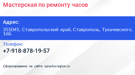 Мастерская по ремонту часов по адресу 355045, Ставропольский край, Ставрополь, Тухачевского, 16Б в дальнейшем Организация, размещена в следующих категориях: