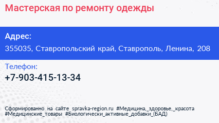 Мастерская по ремонту одежды по адресу 355035, Ставропольский край, Ставрополь, Ленина, 208 в дальнейшем Организация, размещена в следующих категориях: