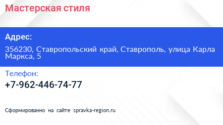 Мастерская стиля по адресу 356230, Ставропольский край, Ставрополь, улица Карла Маркса, 5 в дальнейшем Организация, размещена в следующих категориях: