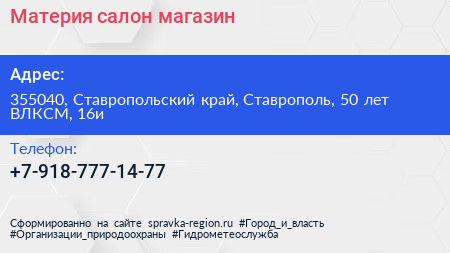 Материя, салон-магазин по адресу 355040, Ставропольский край, Ставрополь, 50 лет ВЛКСМ, 16и в дальнейшем Организация, размещена в следующих категориях: