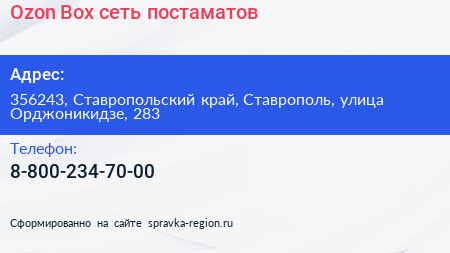 Ozon Box, сеть постаматов по адресу 356243, Ставропольский край, Ставрополь, улица Орджоникидзе, 283 в дальнейшем Организация, размещена в следующих категориях: