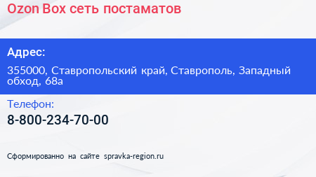 Ozon Box, сеть постаматов по адресу 355000, Ставропольский край, Ставрополь, Западный обход, 68а в дальнейшем Организация, размещена в следующих категориях: