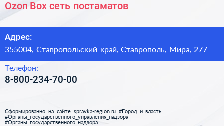 Ozon Box, сеть постаматов по адресу 355004, Ставропольский край, Ставрополь, Мира, 277 в дальнейшем Организация, размещена в следующих категориях: