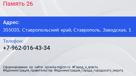 Память-26 по адресу 355035, Ставропольский край, Ставрополь, Заводская, 1 в дальнейшем Организация, размещена в следующих категориях: