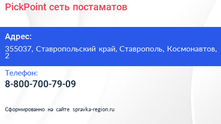 PickPoint, сеть постаматов по адресу 355037, Ставропольский край, Ставрополь, Космонавтов, 2 в дальнейшем Организация, размещена в следующих категориях:
