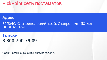 PickPoint, сеть постаматов по адресу 355040, Ставропольский край, Ставрополь, 50 лет ВЛКСМ, 16и в дальнейшем Организация, размещена в следующих категориях: