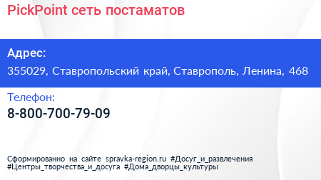 PickPoint, сеть постаматов по адресу 355029, Ставропольский край, Ставрополь, Ленина, 468 в дальнейшем Организация, размещена в следующих категориях: