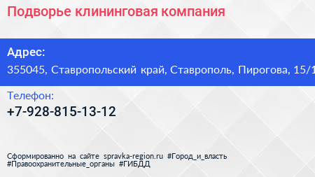Подворье, клининговая компания по адресу 355045, Ставропольский край, Ставрополь, Пирогова, 15/1 в дальнейшем Организация, размещена в следующих категориях: