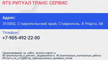 RTS РИТУАЛ ТРАНС СЕРВИС по адресу 355002, Ставропольский край, Ставрополь, 8 Марта, 68 в дальнейшем Организация, размещена в следующих категориях: