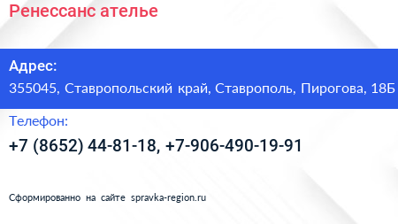 Ренессанс, ателье по адресу 355045, Ставропольский край, Ставрополь, Пирогова, 18Б в дальнейшем Организация, размещена в следующих категориях: