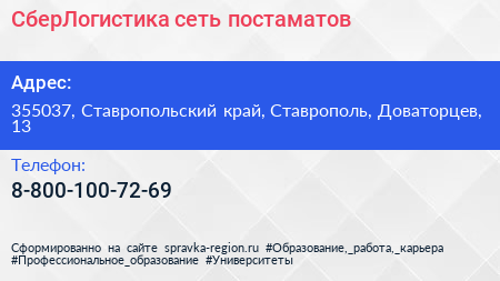 СберЛогистика, сеть постаматов по адресу 355037, Ставропольский край, Ставрополь, Доваторцев, 13 в дальнейшем Организация, размещена в следующих категориях: