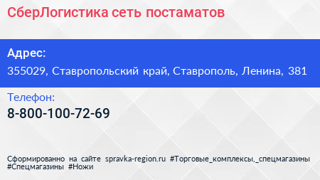 СберЛогистика, сеть постаматов по адресу 355029, Ставропольский край, Ставрополь, Ленина, 381 в дальнейшем Организация, размещена в следующих категориях: