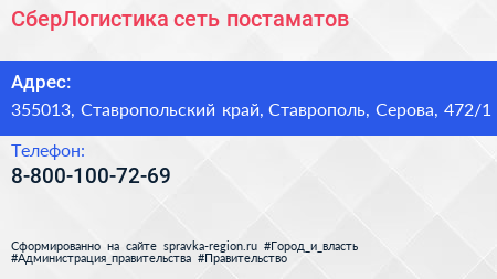 СберЛогистика, сеть постаматов по адресу 355013, Ставропольский край, Ставрополь, Серова, 472/1 в дальнейшем Организация, размещена в следующих категориях: