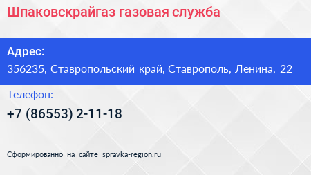Шпаковскрайгаз, газовая служба по адресу 356235, Ставропольский край, Ставрополь, Ленина, 22 в дальнейшем Организация, размещена в следующих категориях: