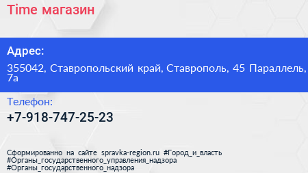 Time, магазин по адресу 355042, Ставропольский край, Ставрополь, 45 Параллель, 7а в дальнейшем Организация, размещена в следующих категориях: