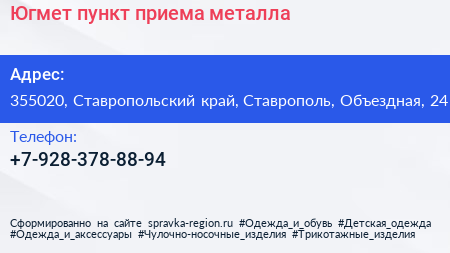 Югмет, пункт приема металла по адресу 355020, Ставропольский край, Ставрополь, Объездная, 24 в дальнейшем Организация, размещена в следующих категориях: