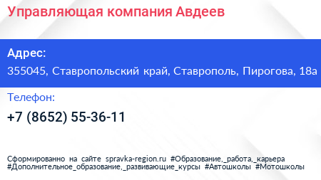 Управляющая компания Авдеев по адресу 355045, Ставропольский край, Ставрополь, Пирогова, 18а в дальнейшем Организация, размещена в следующих категориях: