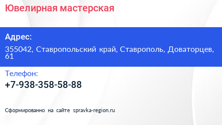Ювелирная мастерская по адресу 355042, Ставропольский край, Ставрополь, Доваторцев, 61 в дальнейшем Организация, размещена в следующих категориях: