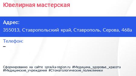 Ювелирная мастерская по адресу 355013, Ставропольский край, Ставрополь, Серова, 468а в дальнейшем Организация, размещена в следующих категориях: