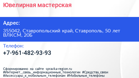 Ювелирная мастерская по адресу 355042, Ставропольский край, Ставрополь, 50 лет ВЛКСМ, 20Б в дальнейшем Организация, размещена в следующих категориях: