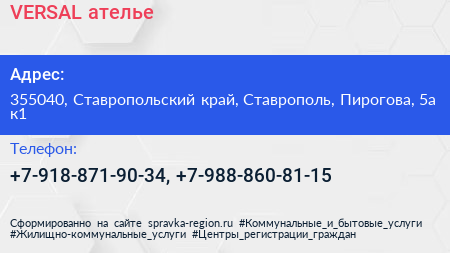 VERSAL, ателье по адресу 355040, Ставропольский край, Ставрополь, Пирогова, 5а к1 в дальнейшем Организация, размещена в следующих категориях: