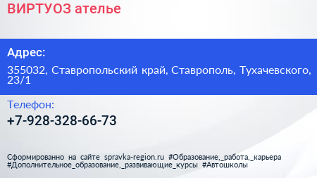 ВИРТУОЗ, ателье по адресу 355032, Ставропольский край, Ставрополь, Тухачевского, 23/1 в дальнейшем Организация, размещена в следующих категориях:
