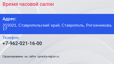 Время, часовой салон по адресу 355021, Ставропольский край, Ставрополь, Рогожникова, 17 в дальнейшем Организация, размещена в следующих категориях:
