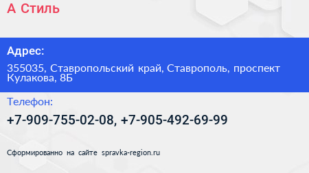 А-Стиль по адресу 355035, Ставропольский край, Ставрополь, проспект Кулакова, 8Б в дальнейшем Организация, размещена в следующих категориях:
