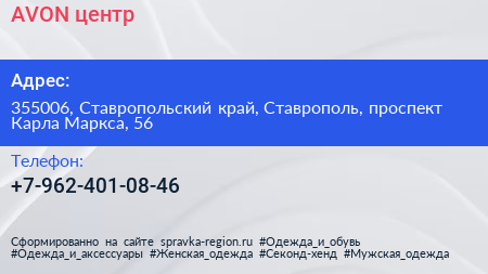 AVON, центр по адресу 355006, Ставропольский край, Ставрополь, проспект Карла Маркса, 56 в дальнейшем Организация, размещена в следующих категориях: