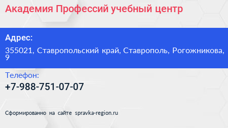 Академия Профессий, учебный центр по адресу 355021, Ставропольский край, Ставрополь, Рогожникова, 9 в дальнейшем Организация, размещена в следующих категориях: