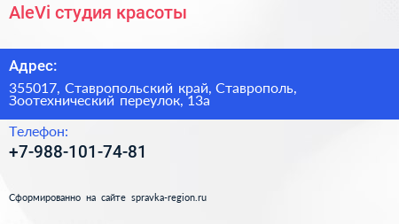 AleVi, студия красоты по адресу 355017, Ставропольский край, Ставрополь, Зоотехнический переулок, 13а в дальнейшем Организация, размещена в следующих категориях: