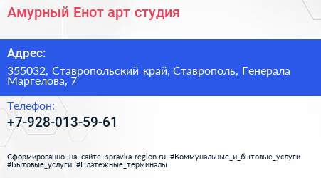 Амурный Енот, арт-студия по адресу 355032, Ставропольский край, Ставрополь, Генерала Маргелова, 7 в дальнейшем Организация, размещена в следующих категориях: