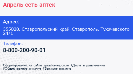 Апрель, сеть аптек по адресу 355028, Ставропольский край, Ставрополь, Тухачевского, 24/1 в дальнейшем Организация, размещена в следующих категориях: