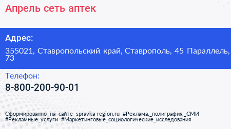 Апрель, сеть аптек по адресу 355021, Ставропольский край, Ставрополь, 45 Параллель, 73 в дальнейшем Организация, размещена в следующих категориях: