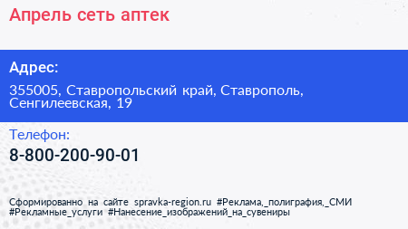 Апрель, сеть аптек по адресу 355005, Ставропольский край, Ставрополь, Сенгилеевская, 19 в дальнейшем Организация, размещена в следующих категориях: