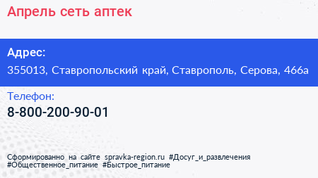 Апрель, сеть аптек по адресу 355013, Ставропольский край, Ставрополь, Серова, 466а в дальнейшем Организация, размещена в следующих категориях: