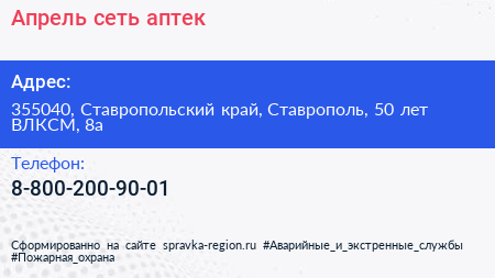 Апрель, сеть аптек по адресу 355040, Ставропольский край, Ставрополь, 50 лет ВЛКСМ, 8а в дальнейшем Организация, размещена в следующих категориях: