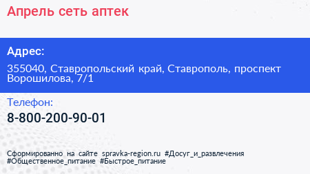 Апрель, сеть аптек по адресу 355040, Ставропольский край, Ставрополь, проспект Ворошилова, 7/1 в дальнейшем Организация, размещена в следующих категориях: