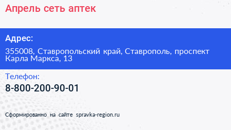 Апрель, сеть аптек по адресу 355008, Ставропольский край, Ставрополь, проспект Карла Маркса, 13 в дальнейшем Организация, размещена в следующих категориях: