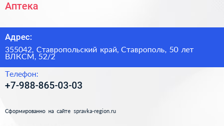 Аптека по адресу 355042, Ставропольский край, Ставрополь, 50 лет ВЛКСМ, 52/2 в дальнейшем Организация, размещена в следующих категориях:
