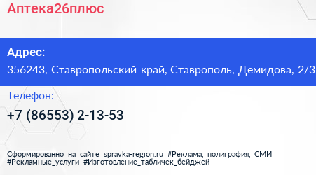 Аптека26плюс по адресу 356243, Ставропольский край, Ставрополь, Демидова, 2/3 в дальнейшем Организация, размещена в следующих категориях: