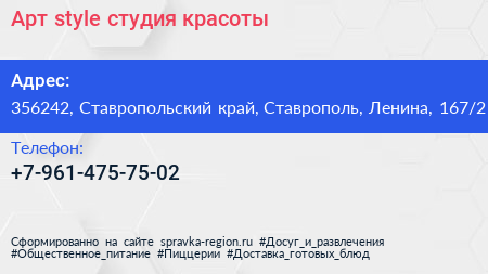 Арт style, студия красоты по адресу 356242, Ставропольский край, Ставрополь, Ленина, 167/2 в дальнейшем Организация, размещена в следующих категориях: