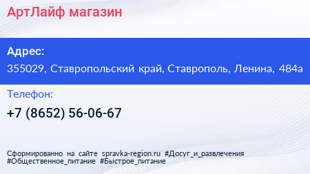 АртЛайф, магазин по адресу 355029, Ставропольский край, Ставрополь, Ленина, 484а в дальнейшем Организация, размещена в следующих категориях: