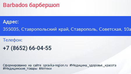 Barbados, барбершоп по адресу 355035, Ставропольский край, Ставрополь, Советская, 10а в дальнейшем Организация, размещена в следующих категориях: