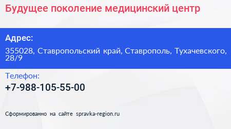 Будущее поколение, медицинский центр по адресу 355028, Ставропольский край, Ставрополь, Тухачевского, 28/9 в дальнейшем Организация, размещена в следующих категориях: