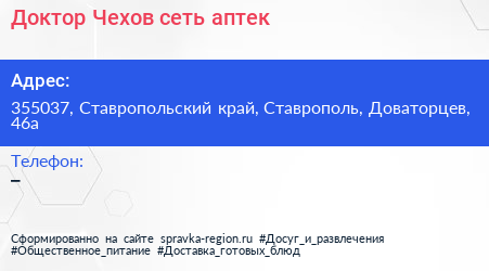 Доктор Чехов, сеть аптек по адресу 355037, Ставропольский край, Ставрополь, Доваторцев, 46а в дальнейшем Организация, размещена в следующих категориях: