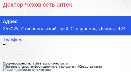 Доктор Чехов, сеть аптек по адресу 355029, Ставропольский край, Ставрополь, Ленина, 424 в дальнейшем Организация, размещена в следующих категориях: